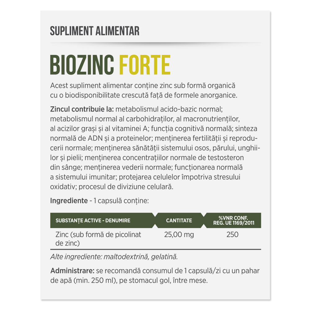 Ingrediente active:1 capsula contine 25,00 mg Zinc (sub forma de picolinat de zinc).