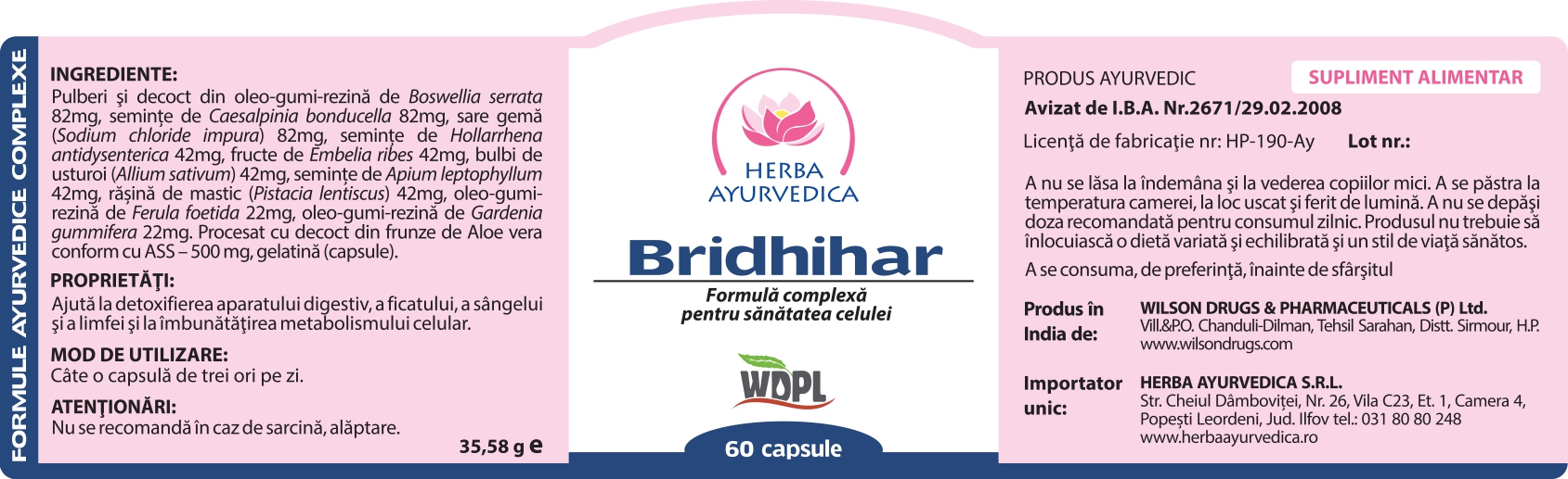 Ingrediente:Pulberi si decoct din oleo-gumi-rezina de Boswellia serrata 82mg, seminte de Caesalpinia bonducella 82mg, sare gema (Sodium chloride impura) 82mg, seminte de Hollarrhena antidysenterica 42mg, fructe de Embelia ribes 42mg, bulbi de usturoi (Allium sativum) 42mg, seminte de Apium leptophyllum 42mg, rasina de mastic (Pistacia lentiscus) 42mg, oleo-gumi- rezina de Ferula foetida 22mg, oleo-gumi-rezina de Gardenia gummifera 22mg. Procesat cu decoct din frunze de Aloe vera conform cu ASS - 500 mg, gelatina (capsule).