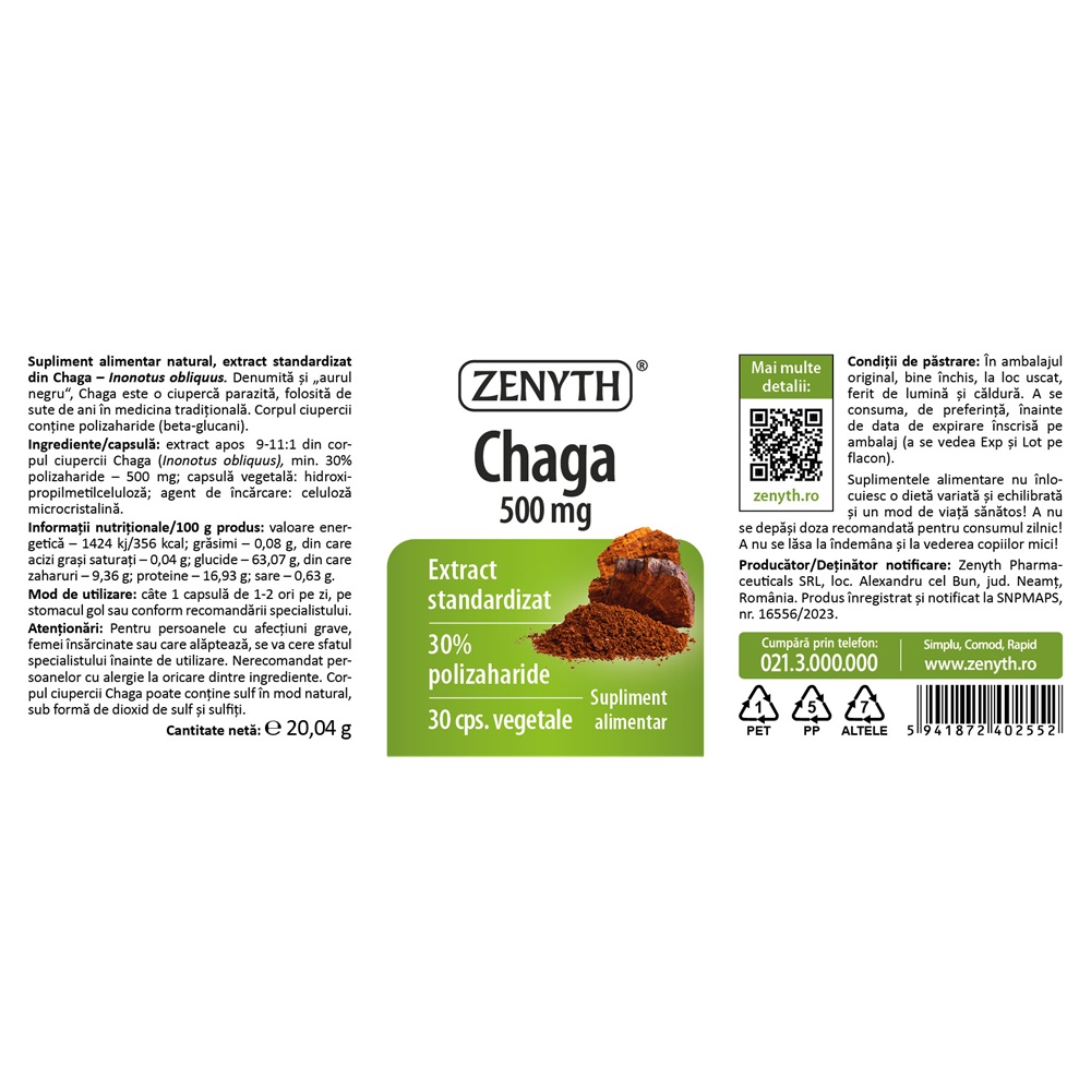 Chaga 500 mg 30 capsule vegetale Zenyth(30% polizaharide) face parte din categoria supliment alimentar.