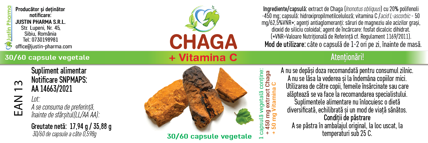 Ingrediente:Per capsula: extract de Chaga (/nonotus obliquus) cu 20% polifenoli -450 mg; capsula: hidroxipropilmetilceluloza; vitamina C / acid L-ascorbic - 50 mg/62,5%VNR *; agenti antiaglomeranti: saruri de magneziu ale acizilor grasi, dioxid de siliciu coloidal; agent de incarcare: fosfat dicalcic dihidrat.