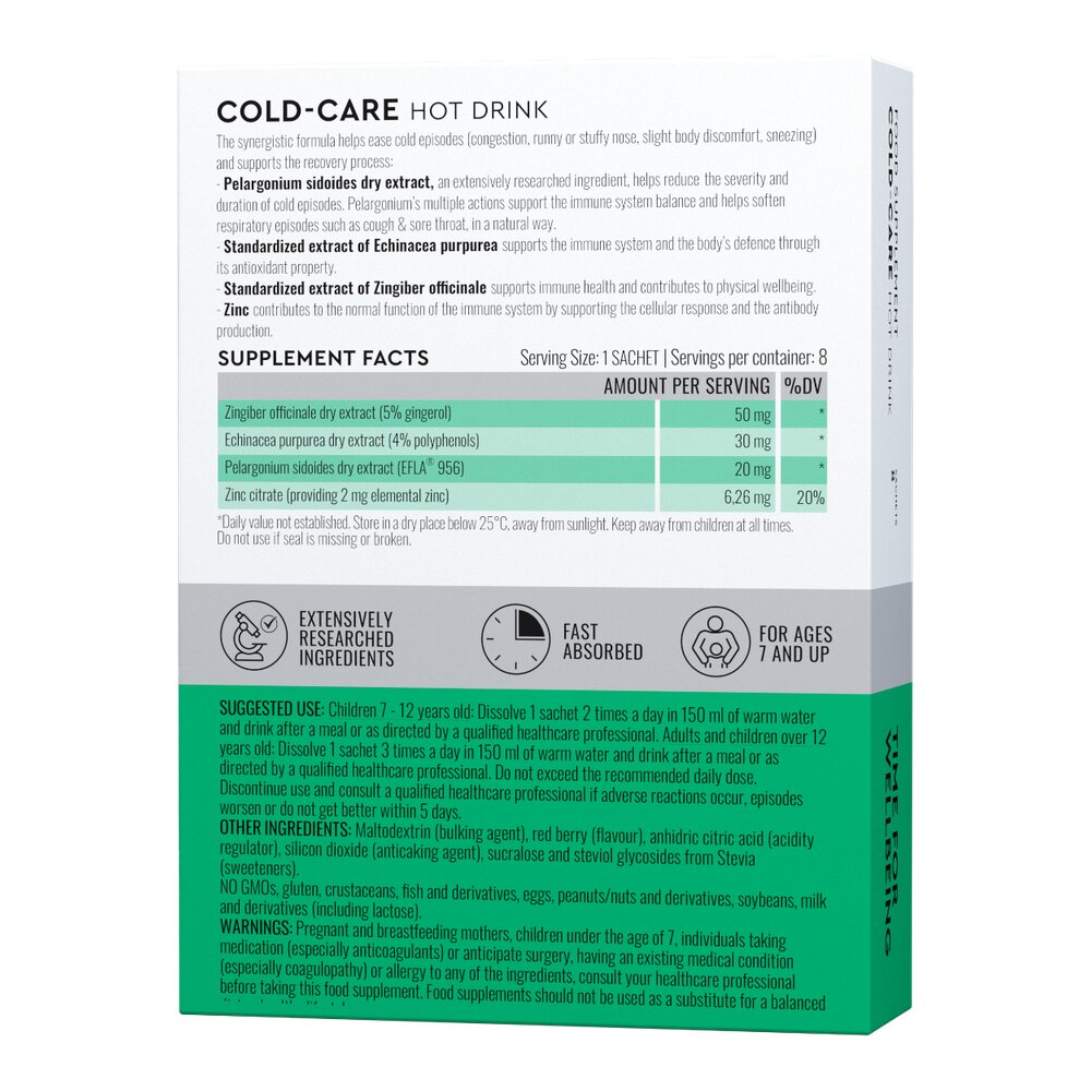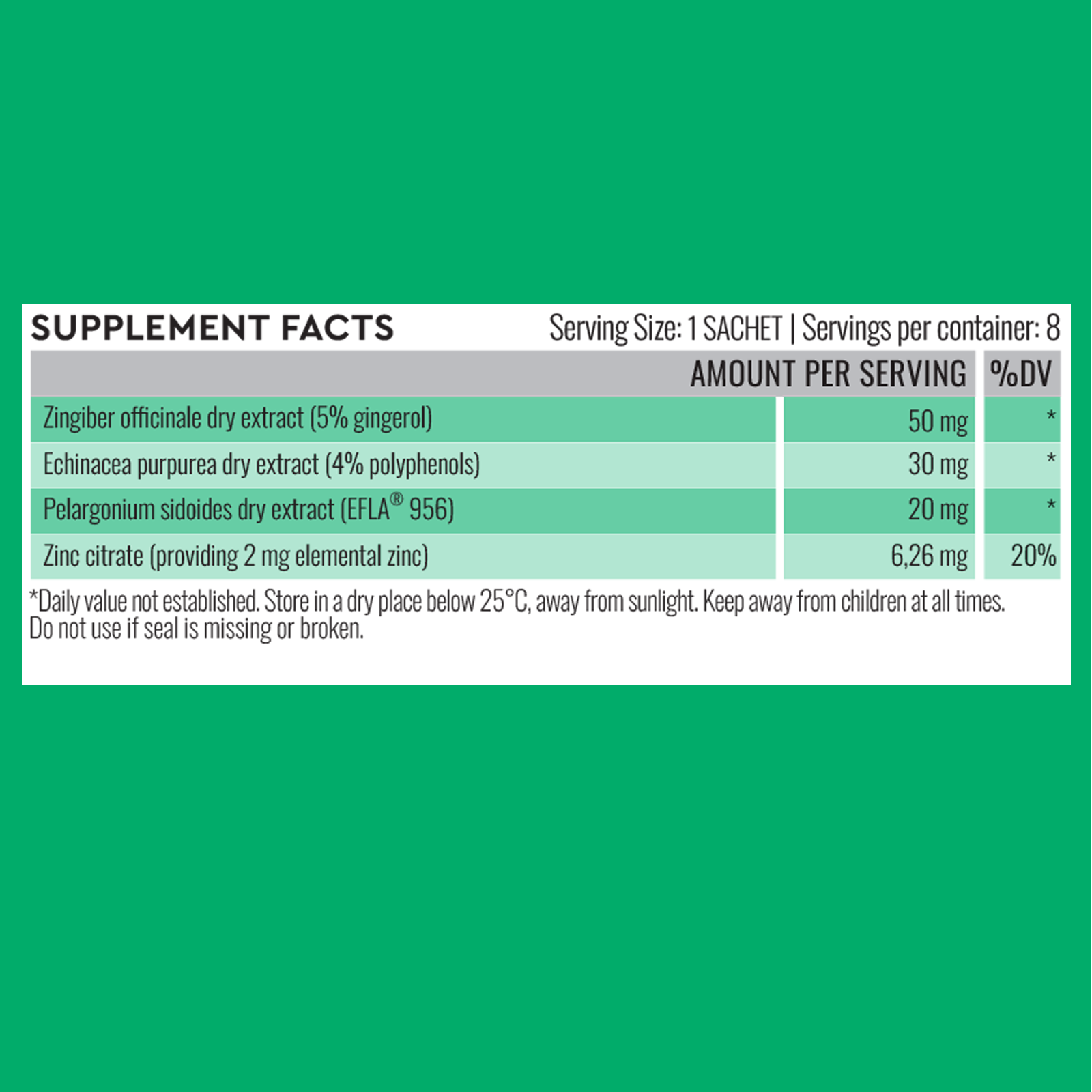 Per 1 plic: maltodextrina (agent de incarcare), aroma de fructe de padure, acid citric anhidru (acidifiant), Ghimbir (Zingiber officinale)(extract standardizat din radacina, garantat 5% gingerol) 50mg, Echinacea (Echinacea purpurea)(extract standardizat din radacina, garantat 4% polifenoli) 30mg, Muscata (Pelargonium sidoides DC/EFLA® 956)(extract standardizat din radacina) 20mg, Citrat de zinc (furnizand 2 mg Zinc) 6.26mg (20%VNR*), dioxid de siliciu (agent antiaglomerant), sucraloza (indulcitor), glicozide steviolice din Stevia (Stevia rebaudiana)(indulcitor). *Valoarea Nutritionala de Referinta conform Regulamentului 1169/2011.