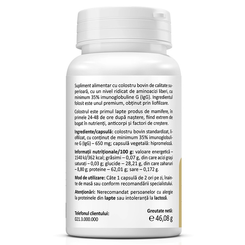 Ingrediente:Colostru bovin standardizat, liofilizat, cu continut de minimum 35% imunoglobuline G (IgG) - 650 mg.