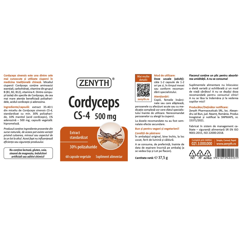Extract 35-40:1 din miceliu de Cordyceps sinensis CS-4, standardizat cu min. 30% polizaharide, 10% manitol (acid cordicepic), 1% adenozină – 500 mg. Capsulă vegetală: hipromeloză.