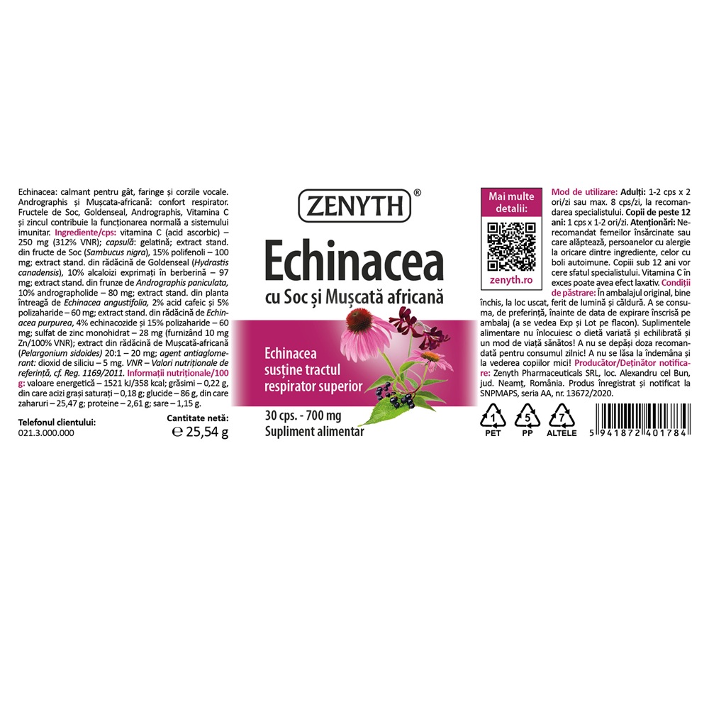 Echinacea cu Soc si Muscata africana 700 mg 30 capsule Zenyth(Echinacea poate contribui la sustinerea tractului respirator superior) face parte din categoria supliment alimentar grupa preparate fitoterapice plante medicinaleextract de echinacea (echinacea angustifolia).