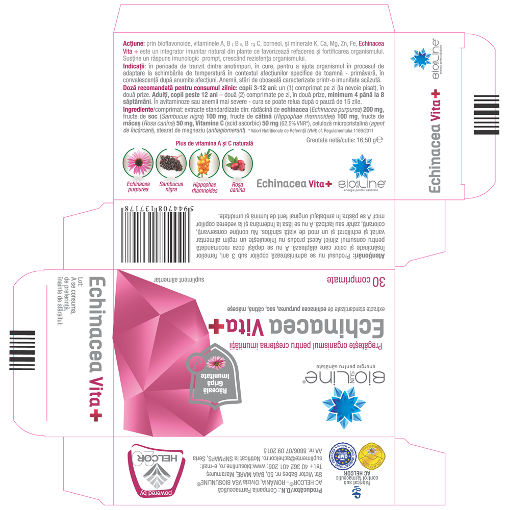 - prin bioflavonoide, vitaminele A, B1, B6, B12, C, borneol, şi minerale K, Ca, Mg, Zn, Fe, Echinacea Vita + este un integrator imunitar natural din plante ce poate contribui la refacerea și fortificarea organismului;