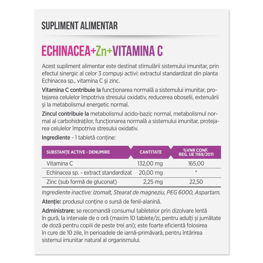 Aspartam, Echinacea, Izomalt, Stearat de magneziu vegetal, Vitamina C, Zinc.