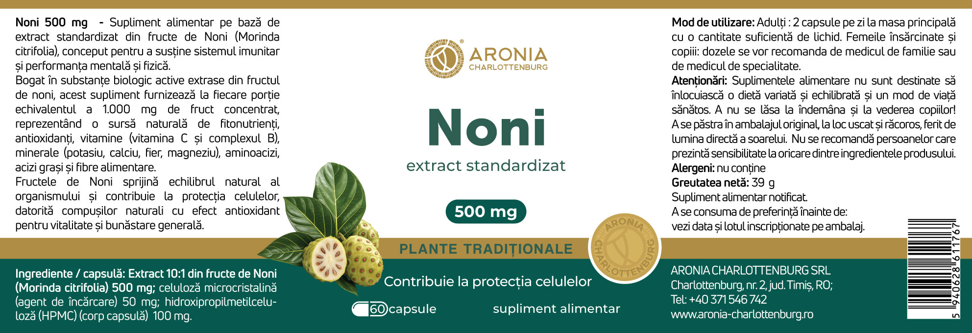Extract standardizat din fructe de Noni, 500 mg, 60 capsule, Aronia Charlottenburg [5940628611767]
