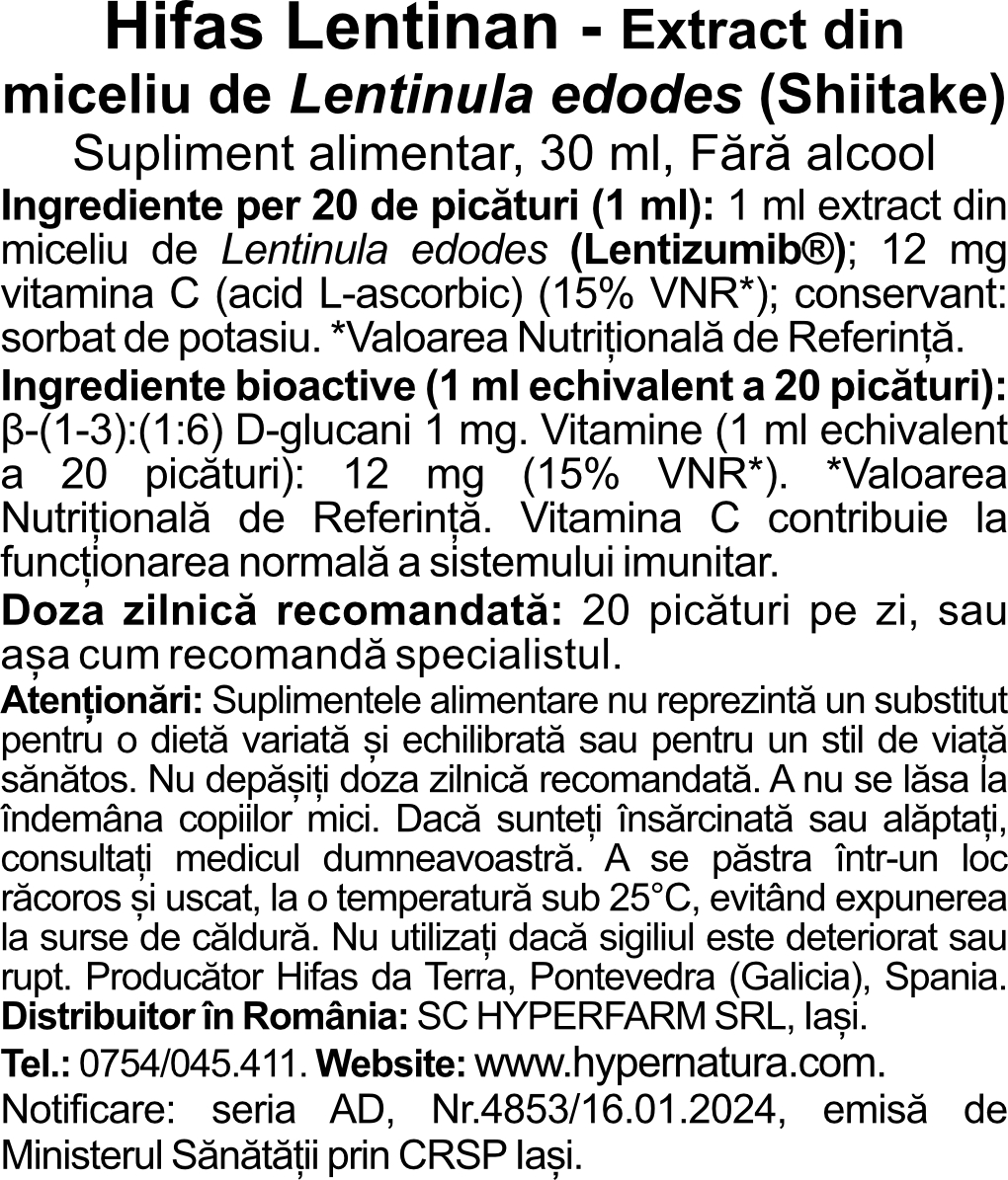 Ingrediente per 20 de picaturi (1 ml): 1 ml extract din miceliu de Lentinula edodes (Lentizumib®), 12 mg vitamina C (acid L-ascorbic) (15% VNR), conservant: sorbat de potasiu.