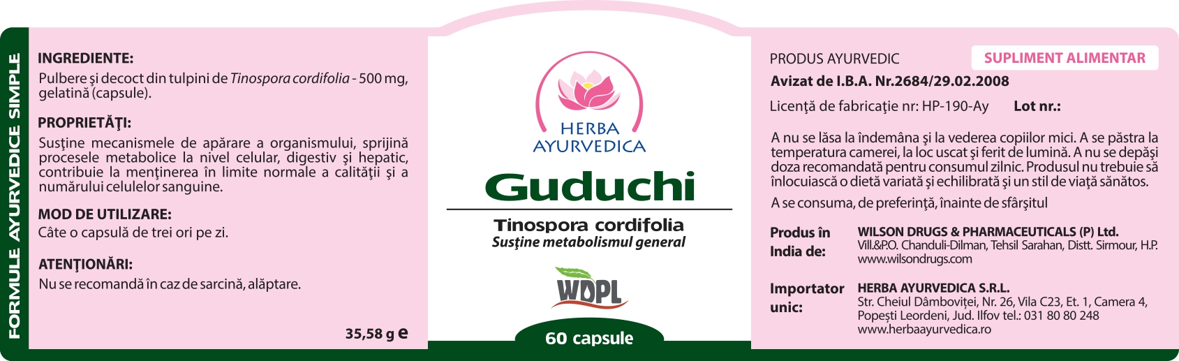 Ingrediente:Pulbere si decoct din tulpini de Tinospora cordifolia - 500 mg, gelatina (capsule).