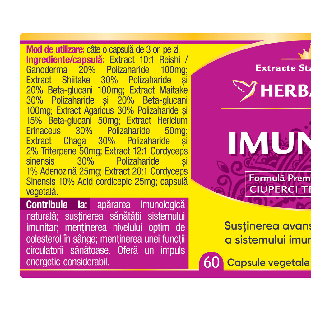 Extract 10:1 Reishi / Ganoderma 20% Polizaharide 100 mg; Extract Shiitake 30% Polizaharide si 20% Beta-glucani 100 mg; Extract Maitake 30% Polizaharide si 20% Beta-glucani 100mg; Extract Agaricus 30% Polizaharide si 15% Beta-glucani 50 mg; Extract Hericium Erinaceus 30% Polizaharide 50 mg; Extract Chaga 30% Polizaharide si 2% Triterpene 50 mg; Extract 12:1 Cordyceps sinensis 30% Polizaharide si 1% Adenozina 25mg; Extract 20:1 Cordyceps Sinensis 10% Acid cordicepic 25 mg; capsula: vegetala.