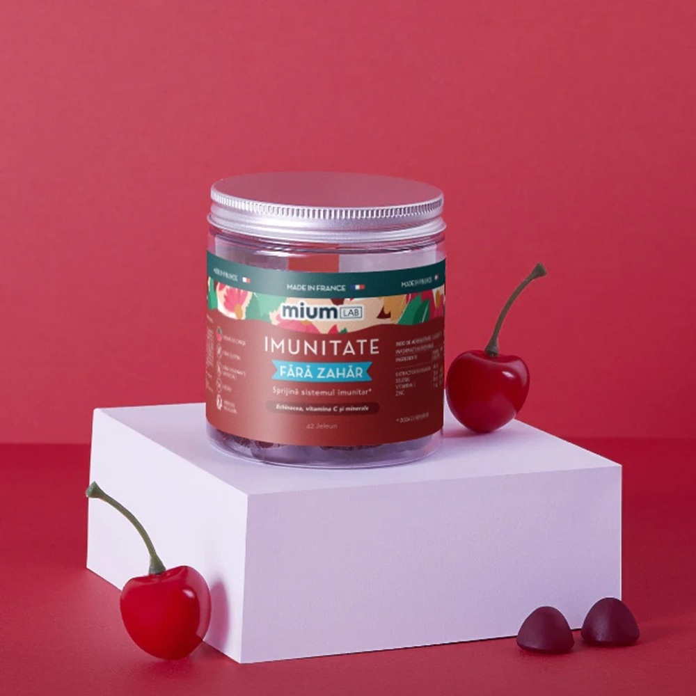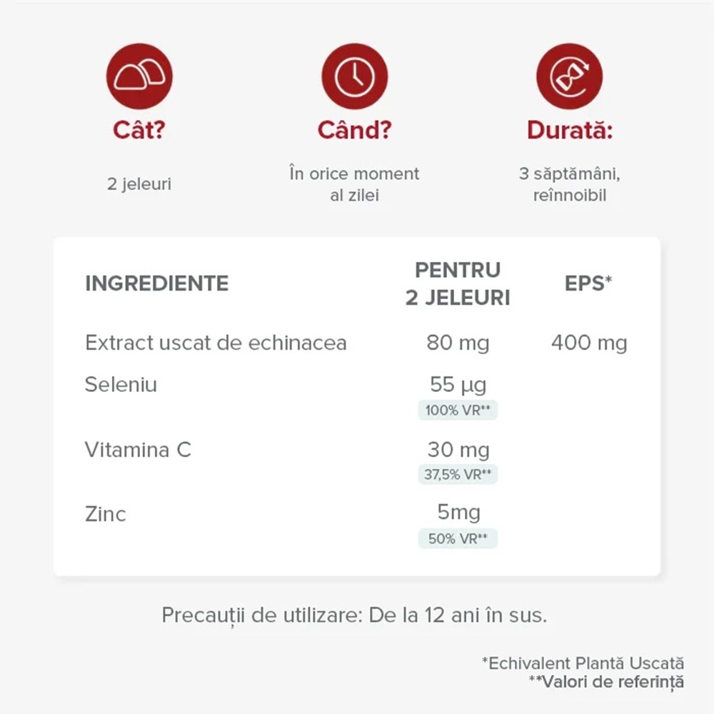 Agent de încărcare: maltitol - extract de rădăcină de echinacea (echinacea angustifolia) - agent de gelifiere: pectină - acidifiant: acid citric - ascorbat de sodiu (vitamina c) - aromă naturală - citrat de zinc - acid ascorbic (vitamina c) - acidifiant: citrate de sodiu selenitul de sodiu - concentrat (carrot daucus carota și cassis ribes nigrum l.) - agent de acoperire: ceară de carnauba.