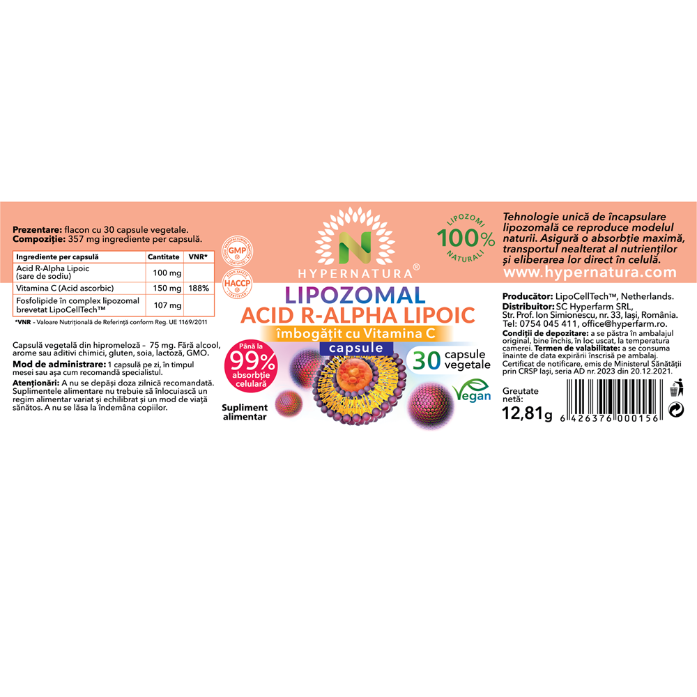 Lipozomal Acid R-Alpha-Lipoic 30 capsule vegetale Hypernatura(contine vitamina C) face parte din categoria supliment alimentar , contine ingrediente activeacid alfa lipoic (ala).