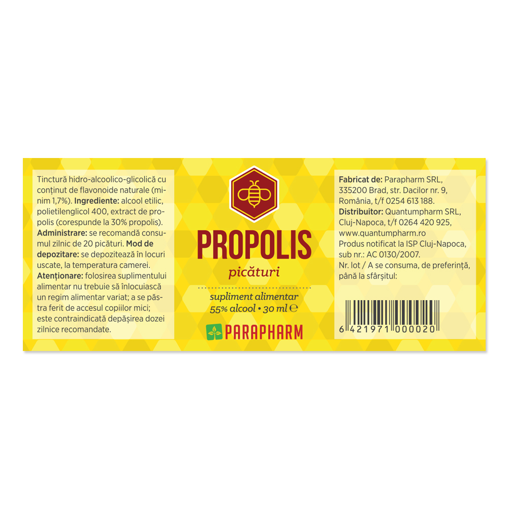 - Propolisul picaturi este un extract alcoolic care contine 30% propolis;