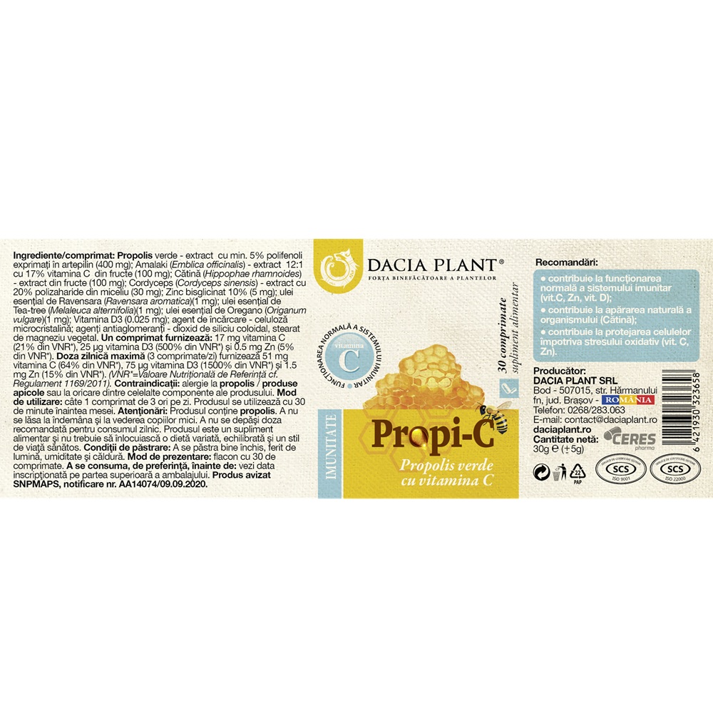- supliment alimentar cu Propolis Verde 400 mg, Vitamina C, zinc si D3;