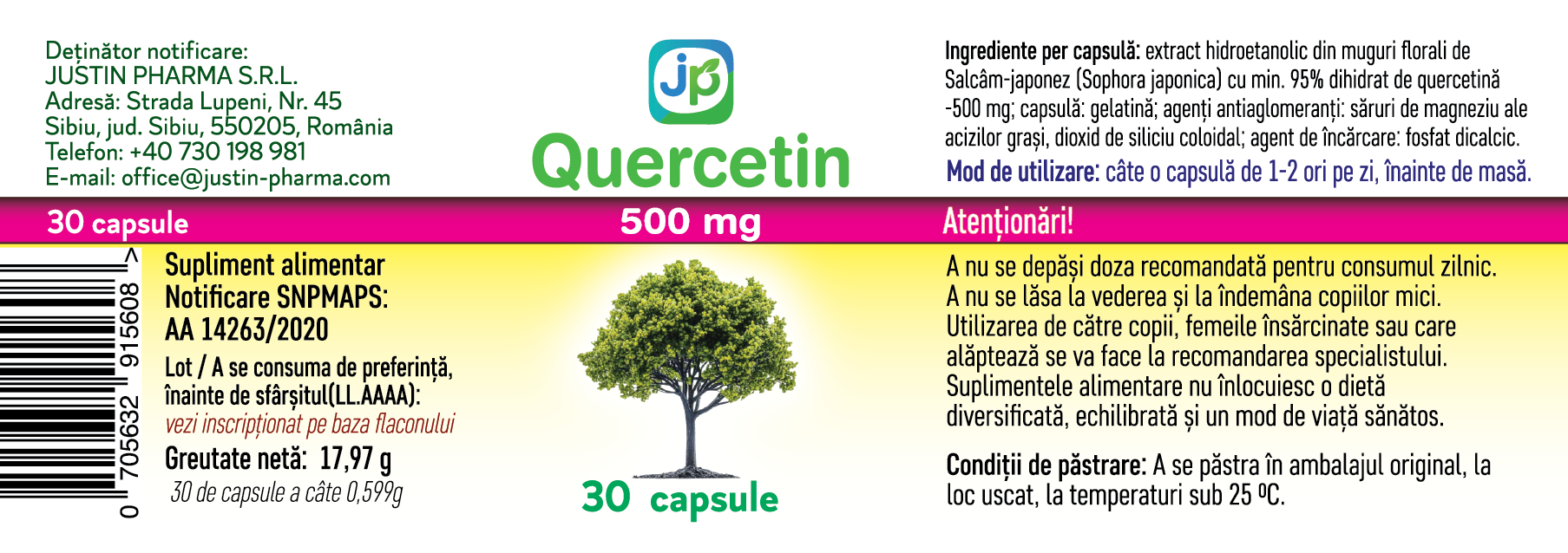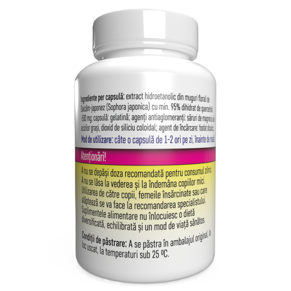 Ingrediente:Extract hidroetanolic din muguri florali de Salcam-japonez (Sophora japonica) cu min. 95% dihidrat de quercetina -500 mg; capsula: gelatina; agenti antiaglomeranti: saruri de magneziu ale acizilor grasi, dioxid de siliciu coloidal; agent de incarcare: fosfat dicalcic.