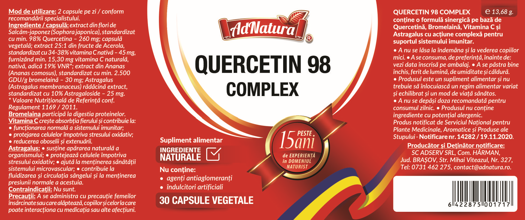 Ingrediente:Per capsulă: extract din flori de Salcâm-japonez (Sophora japonica), standardizat cu min. 98% Quercetina - 260 mg; capsulä vegetală; extract 25:1 din fructe de Acerola, standardizat cu 34-38% vitamina C nativă - 45 mg. furnizând min. 15,30 mg vitamina C naturală, nativă, adică 19% VNR*; extract din Ananas (Ananas comosus), standardizat cu min. 2.500 GDU/g bromelaină - 30 mg; Astragalus (Astragalus membranaceus) rădăcină extract, standardizat cu 10% Astragaloside - 25 mg. *Valoare NutriÈ›ională de Referinţă conf. Regulament 1169/2011.