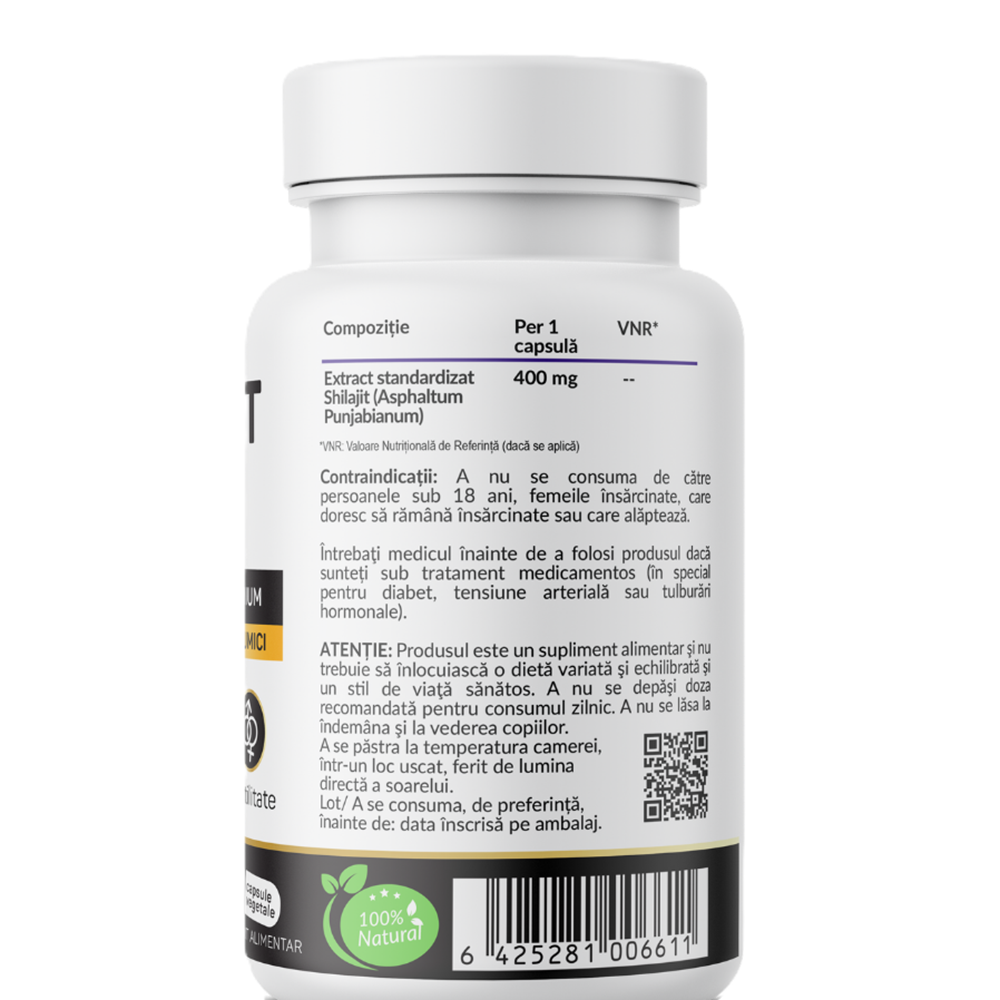 Ingrediente:Extract de rasina de Shilajit Mumio (Asphaltum Punjabianum) – 400 mg, capsula vegetala.