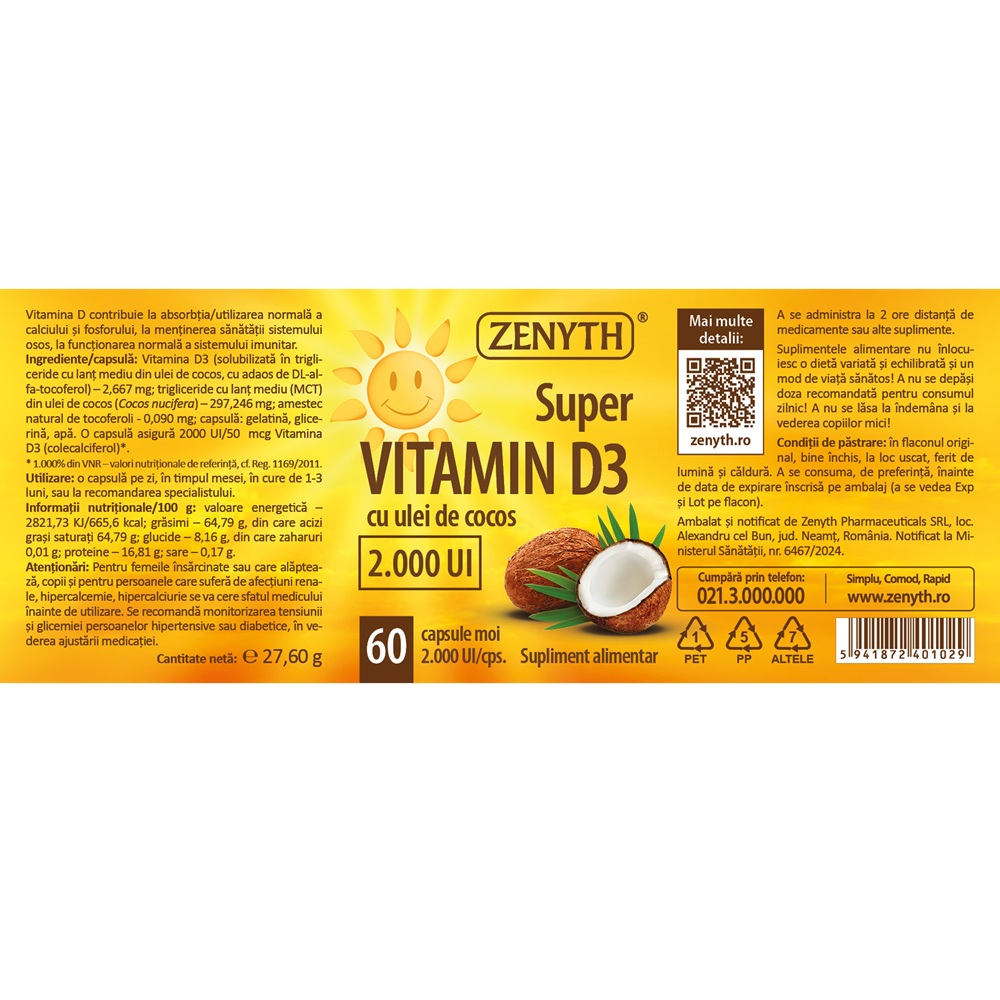 Vitamina D3 (solubilizată în trigliceride cu lanț mediu din ulei de cocos, cu adaos de DL-alfa-tocoferol) 2,667 mg, trigliceride cu lanț mediu (MCT) din ulei de cocos (Cocos nucifera) 297,246 mg, amestec natural de tocoferoli 0,090 mg, capsulă: gelatină, glicerina, apă, o capsulă asigură 2000 UI/50 mcg Vitamina D3 1.000% din VNR (Valori Nutriționale de Referință, cf. Reg. 1169/2011).