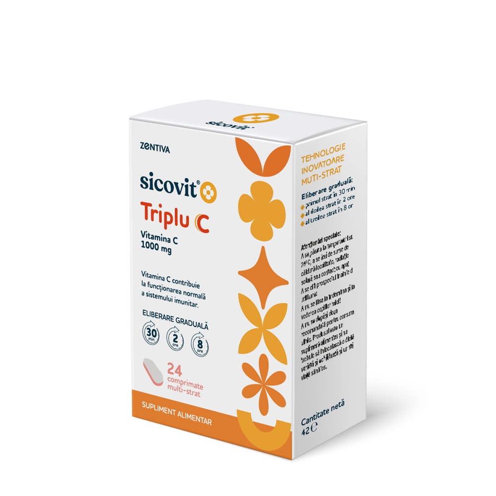 - este un supliment alimentar ce contine 1000 mg vitamina C pe comprimat, repartizate intre cele trei straturi cu eliberare diferita;