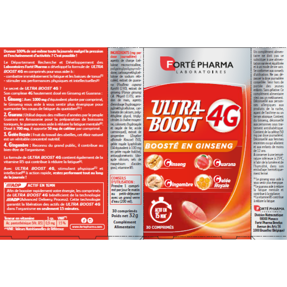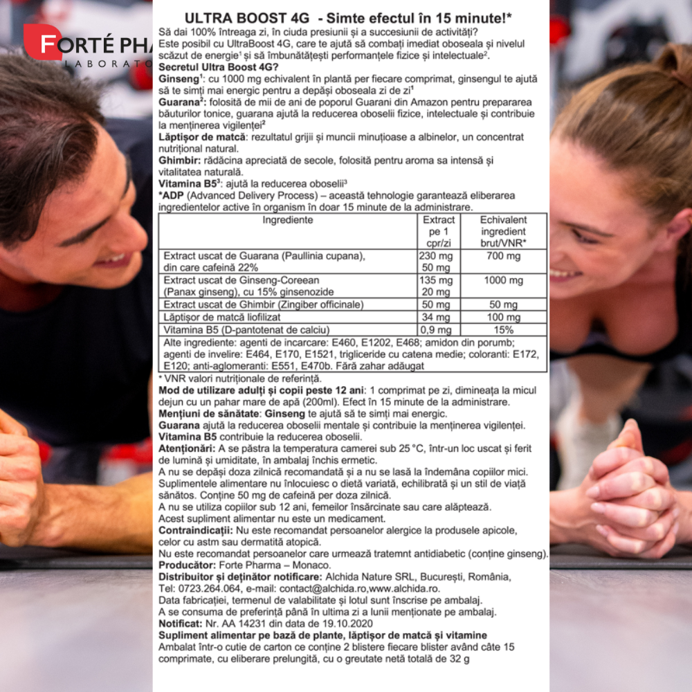 Ultra Boost 4G 30 comprimate Forte Pharma(supliment alimentar pe baza de plante, laptisor de matca si vitamine) face parte din categoria supliment alimentar grupa preparate fitoterapice , contine ingrediente activelaptisor de matca plante medicinaleextract de ghimbir (zingiber officinale), extract de ginseng asiatic (panax ginseng), extract de guarana (paullinia cupana).