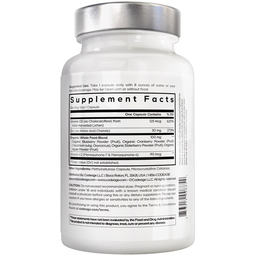 - ofera o combinatie de vitamina D3 (5000 UI ca colecalciferol), zinc (30 mg sub forma de chelat de aminoacid), vitamina K2 (sub formele MK-4 si MK-7) si un amestec de fructe organice intregi (mar, afine, merisoare si fructe de soc pudra);