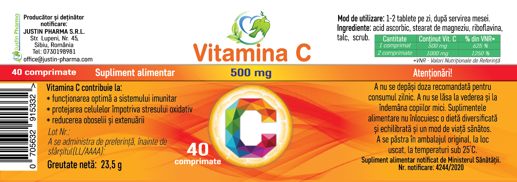 Supliment alimentar notificat de Ministerul Sanatatii. Nr. notificare: 4244/2020.