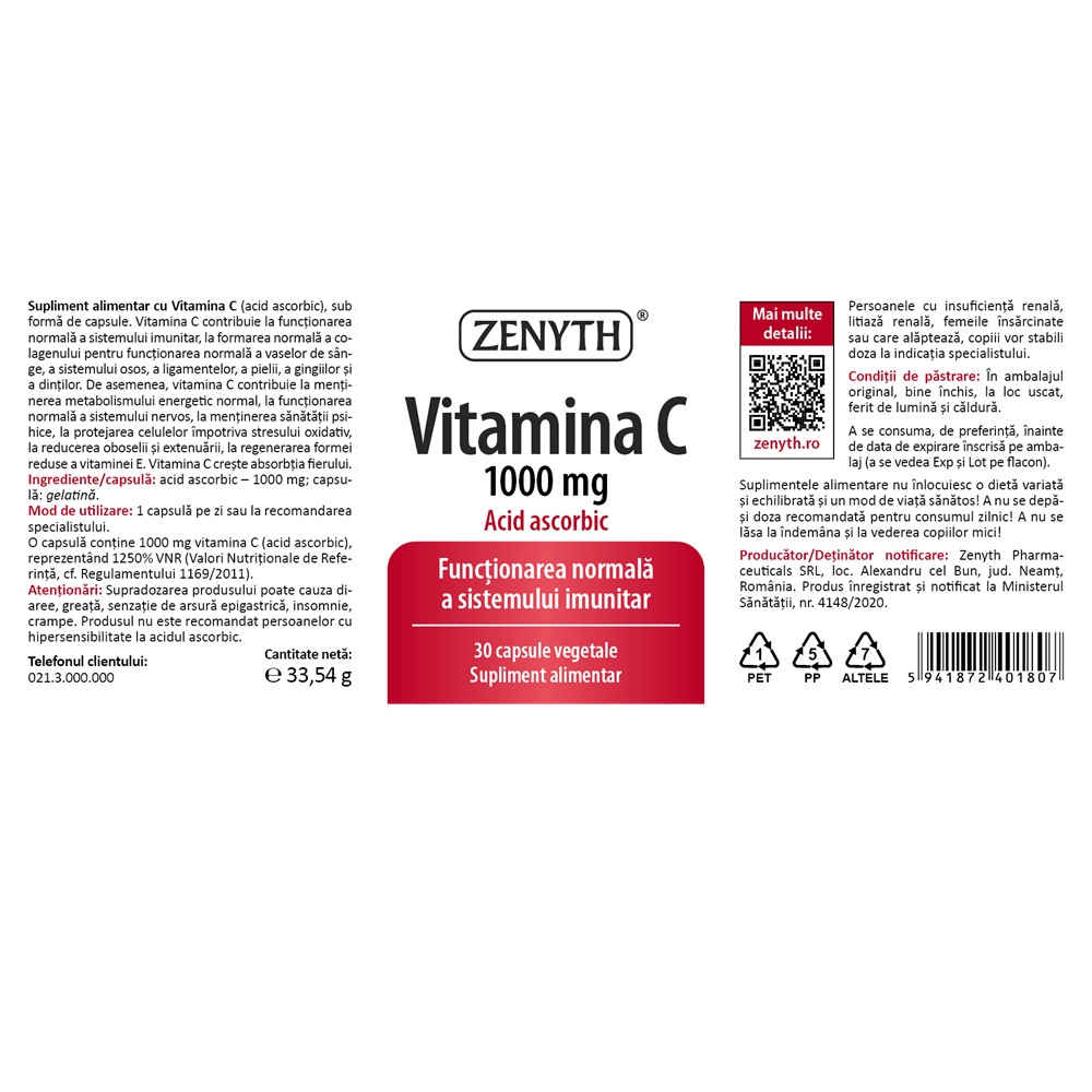 Vitamina C Acid Ascorbic 1000 mg 30 capsule Zenyth(poate contribui la functionarea normala a sistemului imunitar) face parte din categoria supliment alimentar grupa vitamine , contine ingrediente activevitamina c (acid ascorbic).
