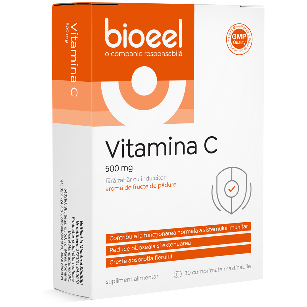 Vitamina C cu aroma de fructe de padure 500 mg 30 comprimate masticabile Bioeel(nu contine zahar) face parte din categoria supliment alimentar grupa vitamine , contine ingrediente activevitamina c (acid ascorbic).