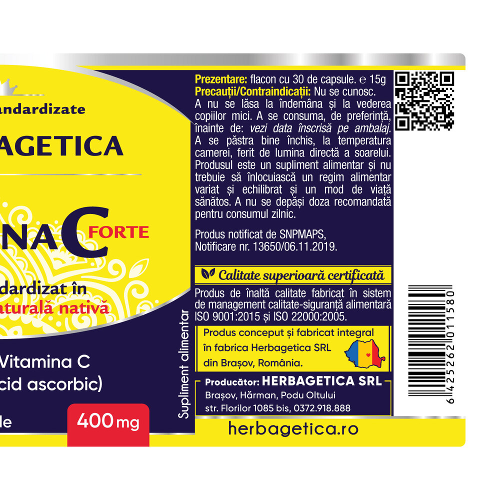 Extract 4:1 Acerola (Malpighia glabra) standardizat 17% Vitamina C naturala nativa (furnizand 68 mg Vitamina C naturala nativa 85% VNR*): 400 mg; capsula: vegetala.
