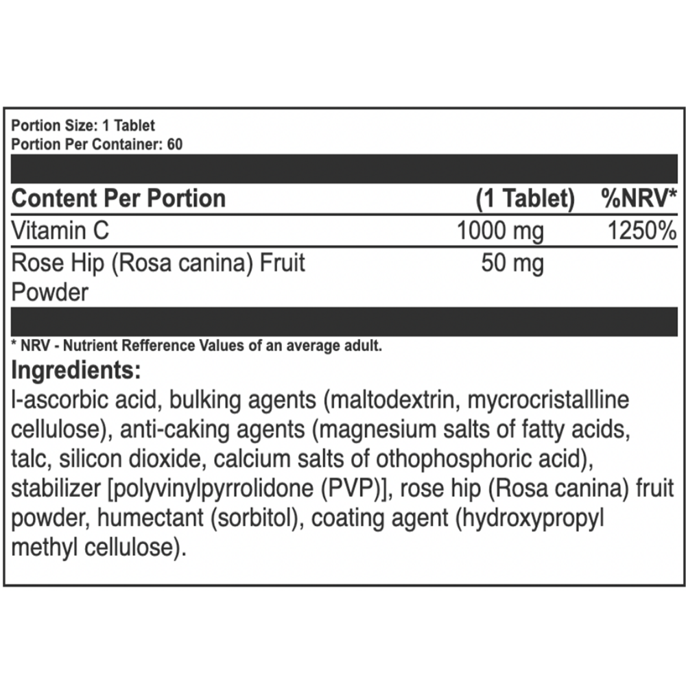 Acid L-ascorbic, agenti de incarcare (maltodextrina, celuloza microcristalina), agenti antiaglomeranti (saruri de magneziu ale acizilor grasi, talc, dioxid de siliciu,
