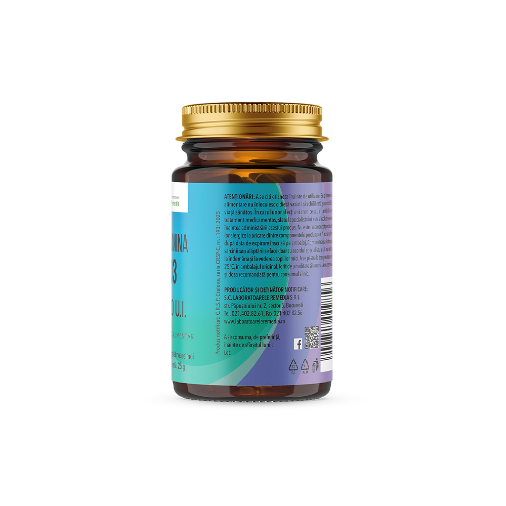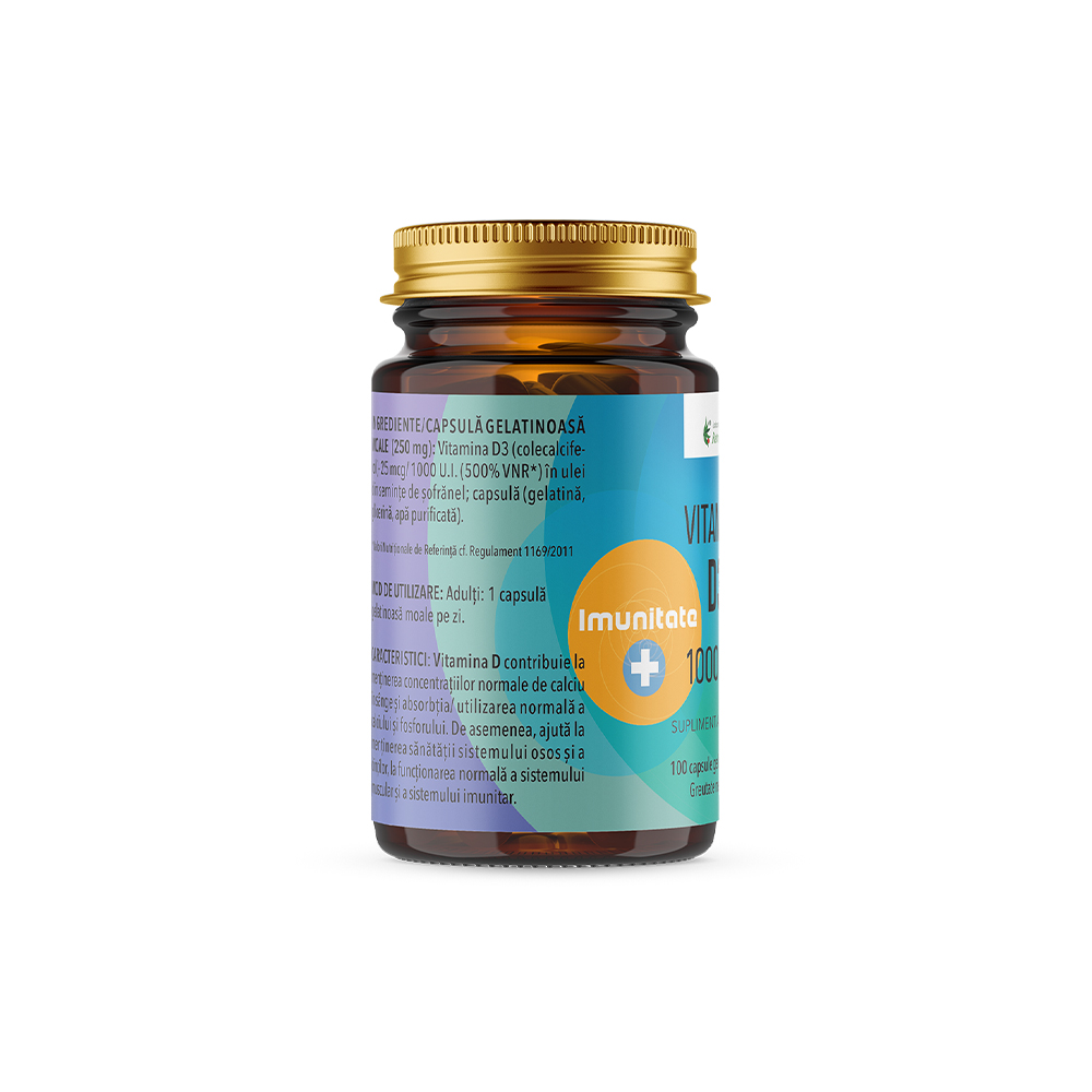 - Vitamina D3 1000 U.I. ofera o doza echilibrata de colecalciferol (25 mcg/capsula), ideala pentru mentinerea nivelurilor optime de vitamina D in organism;