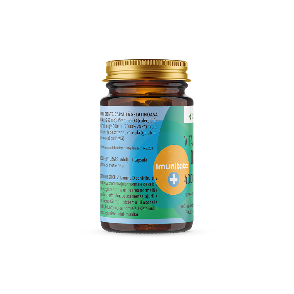 Ingrediente:Vitamina D3 (colecalciferol) – 4000 U.I. / 100 mcg.Ingrediente/capsulă gelatinoasă moale (250 mg): Vitamina D3 (colecalciferol)- 100 mcg/ 4000 U.I. (2000% VNR*) în ulei din semințe de șofrănel; capsulă (gelatină, glicerină, apă purificată).