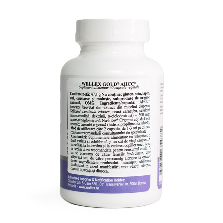 Ingrediente:Per capsula: AHCC® (amestec brevetat din extract din miceliul ciupercii Shiitake/ Lentinula edodes, ceara carnauba, celuloza microcristalina, dextrina, α-ciclodextrina) – 500 mg; agent antiaglomerant: Nu-Flow® Organic/ coji de Orez organic; capsula vegetala (hidroxipropilmetilceluloza).