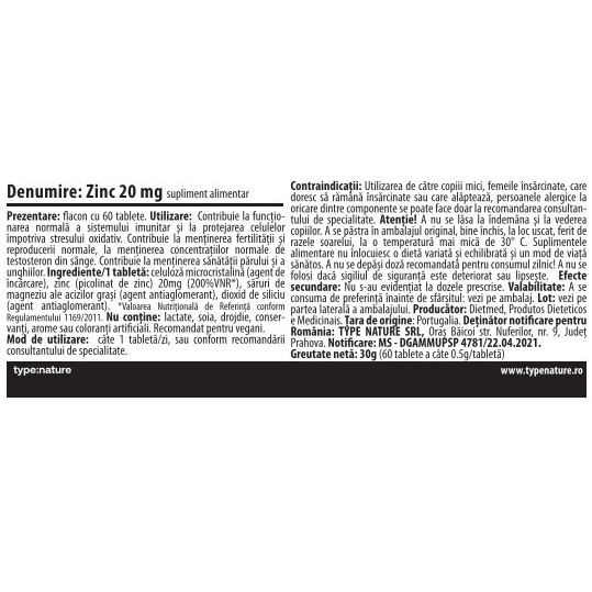 Celuloza microcristalina (agent de incarcare), zinc (picolinat de zinc) 20 mg (200%VNR*), saruri de magneziu ale acizilor grasi (agent antiaglomerant), dioxid de siliciu (agent antiaglomerant).