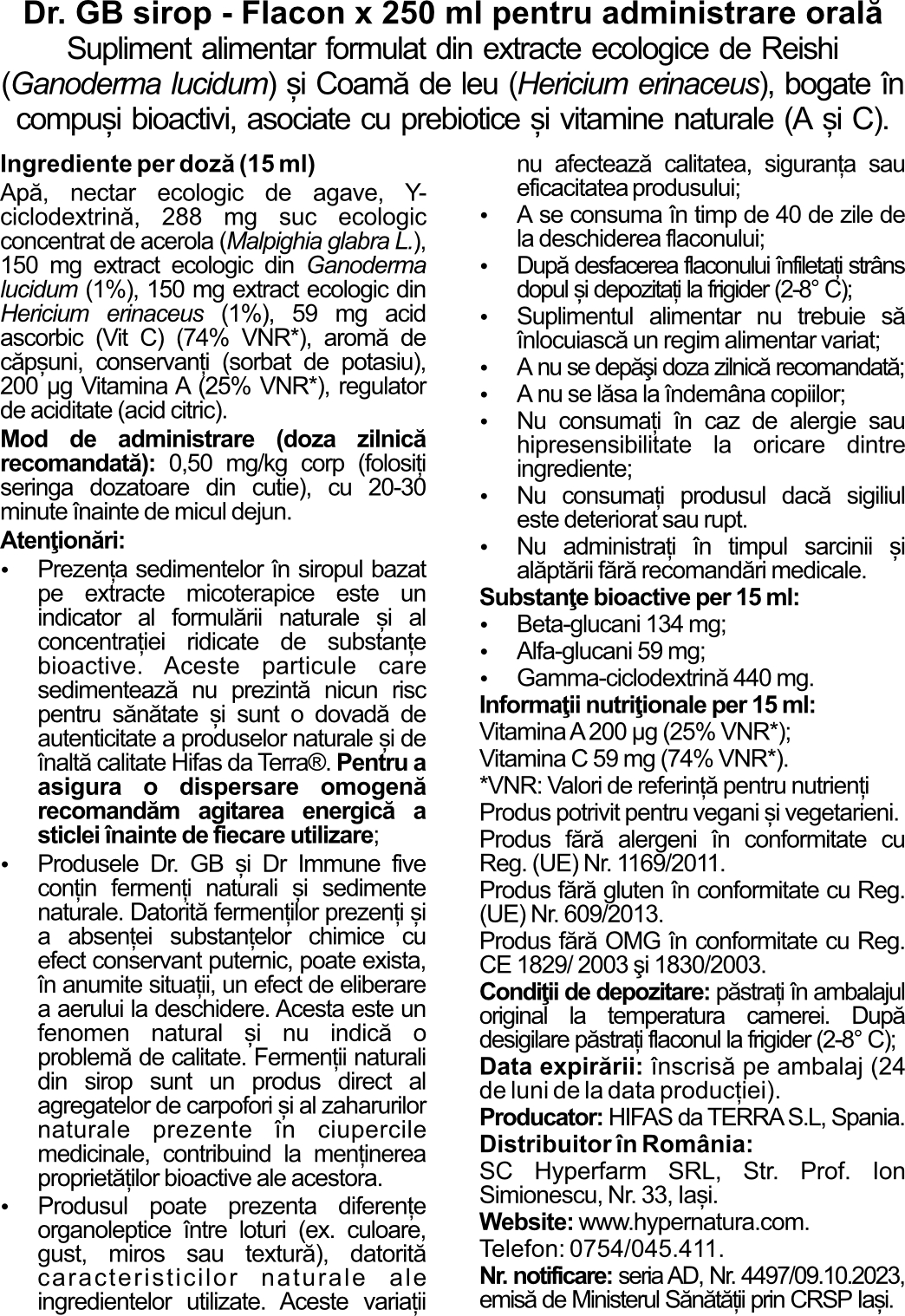 Sirop din extracte de reishi si coama de leu Dr. GB, 250 ml, Hifas da Terra