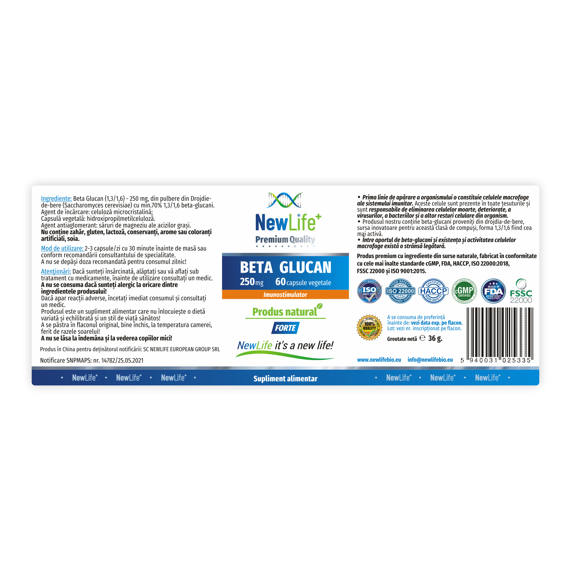 Produs premium cu ingrediente din surse naturale, fabricat în conformitate cu cele mai înalte standarde din industria farmaceutică și pentru siguranță alimentară: cGMP, US-FDA, HACCP, ISO 22000:2018, FSSC 22000 și ISO 9001:2015.