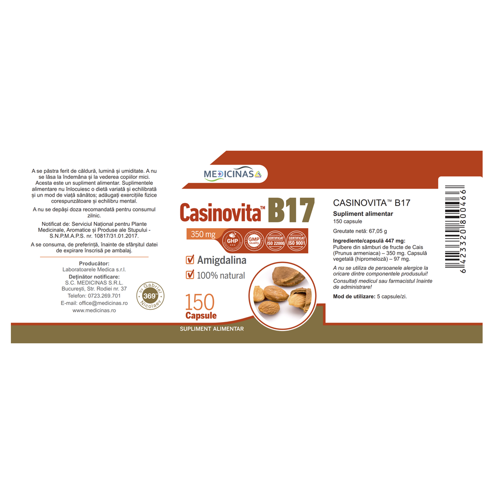 Casinovita B17 350 mg 150 capsule Medicinas(poate contribui la sustinerea sistemului imunitar) face parte din categoria supliment alimentar , contine ingrediente activevitamina b17.