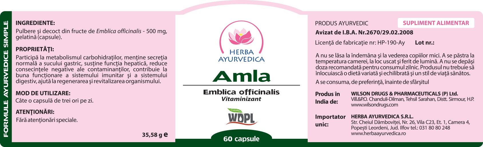 Ingrediente:Pulbere si decoct din fructe de Emblica officinalis - 500 mg, gelatina (capsule).
