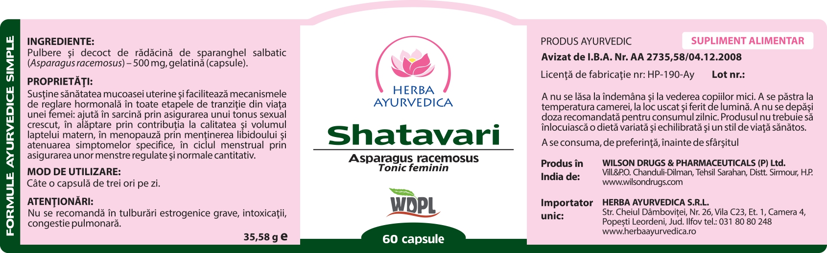 Ingrediente:Pulbere si decoct de radacina de sparanghel salbatic (Asparagus racemosus) - 500 mg, gelatina (capsule).