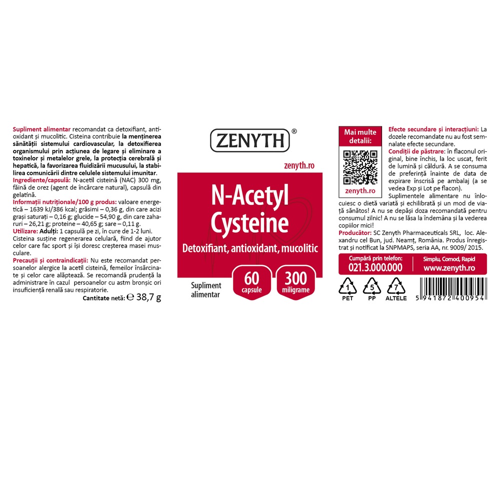 Ingrediente:N-acetil cisteina (NAC) 300 mg, faina de orez (agent de incarcare natural), capsula din gelatina.