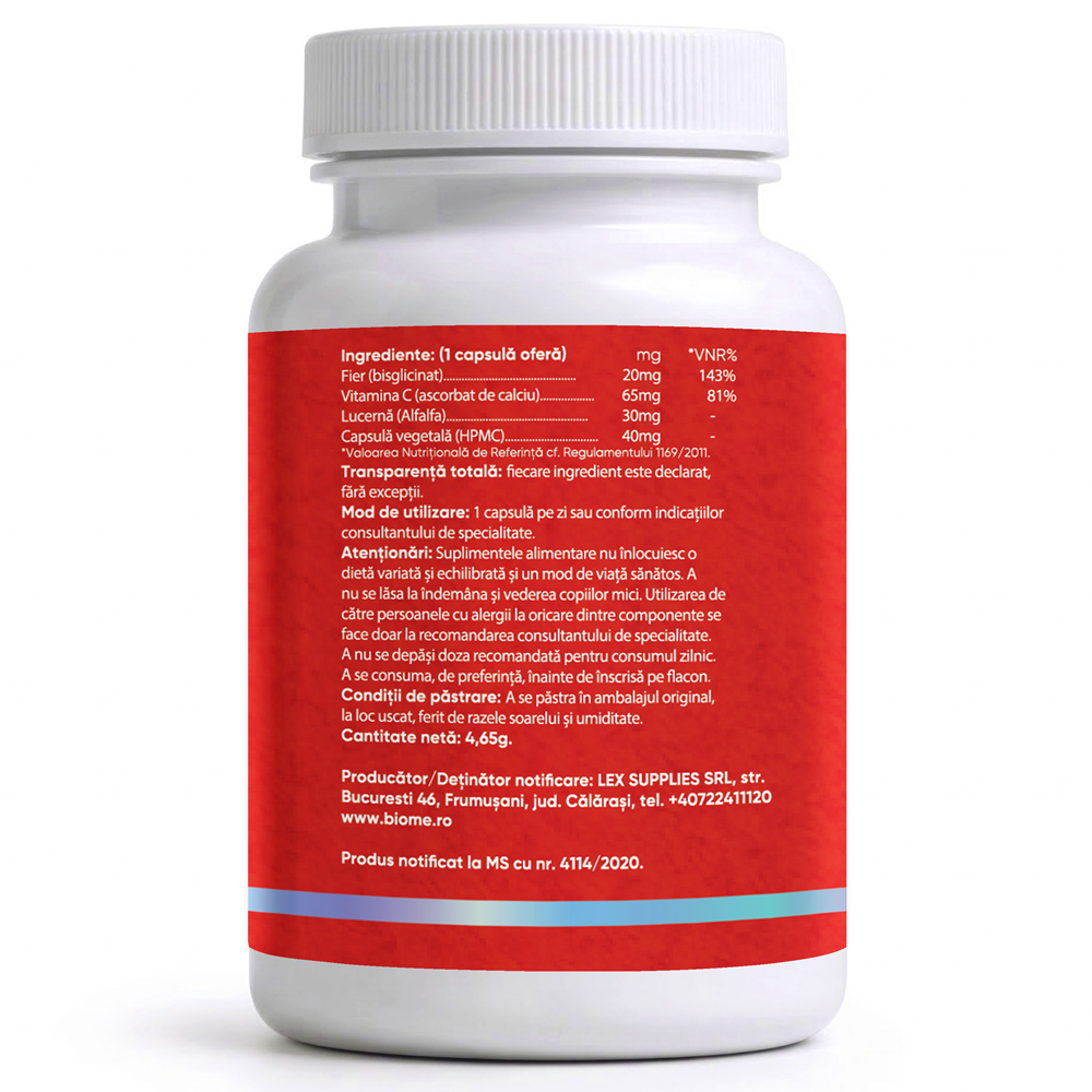 - fier 20mg+ furnizeaza 20mg fier elementar sub forma de bisglicinat de fier, o forma chelata recunoscuta pentru biodisponibilitate ridicata si toleranta digestiva superioara;