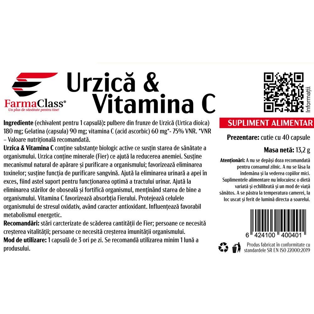 Pentru 1 capsula: pulbere din frunze de Urzica (Urtica dioica) 180 mg; Gelatina (capsula) 90 mg; vitamina C (acid ascorbic) 60 mg *- 75% VNR. *VNR - Valoare nutritionala recomandata.