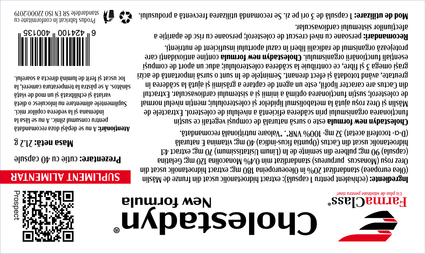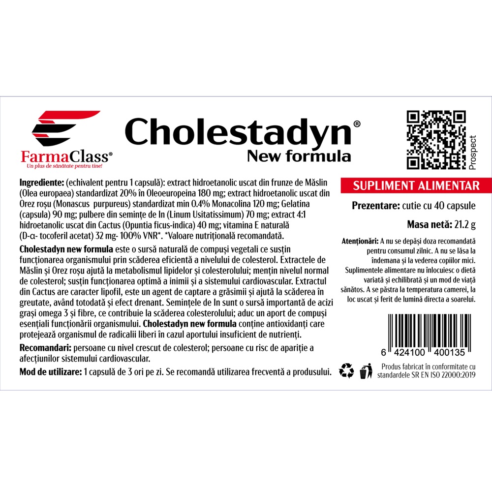 Ingrediente:Per 1 capsula: extract hidroetanolic uscat din frunze de Maslin (Olea europaea) standardizat 20% in oleoeuropeina 180 mg, extract hidroetanolic uscat din orez rosu (Monascus purpureus) standardizat min. 0.4% monacolina 120 mg, gelatina (capsula) 90 mg, pulbere din seminte de in (Linum usitatissimum) 70 mg, extract 4:1 hidroetanolic uscat din cactus (Opuntia ficus-indica) 40 mg, vitamina E naturala (D-a-tocoferil acetat) 32 mg – 100%.