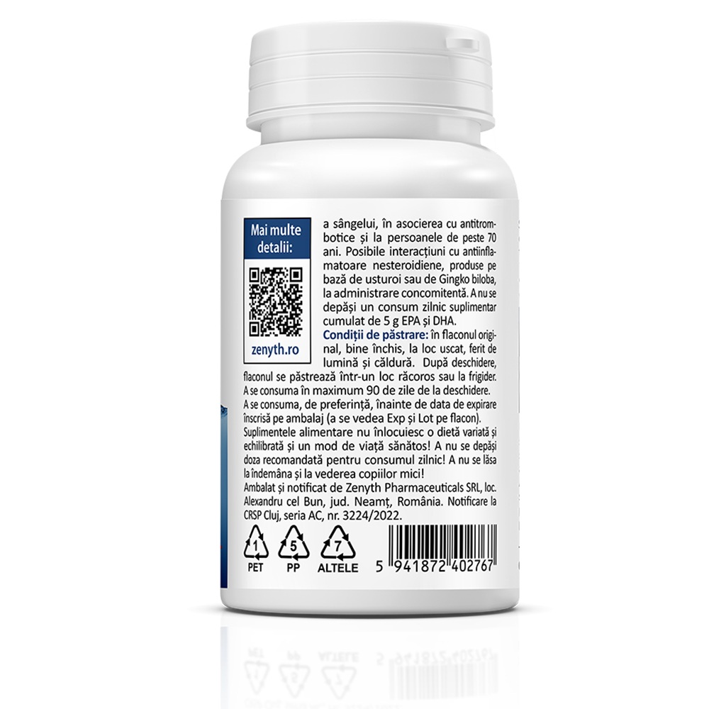 Ingrediente:Ulei de peste, sub forma de trigliceride, cu min. 40% EPA, min. 30% DHA – 1000 mg; Vitamina E naturala (d-alfa-tocoferol) – 10 mg; Capsula: gelatina din peste, glicerina vegetala, apa.