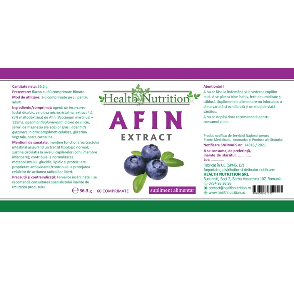 Afin 60 mg 60 comprimate Health Nutrition(extract de afin (Vaccinium myrtillus)) face parte din categoria supliment alimentar plante medicinaleextract de afin (vaccinium myrtillus).