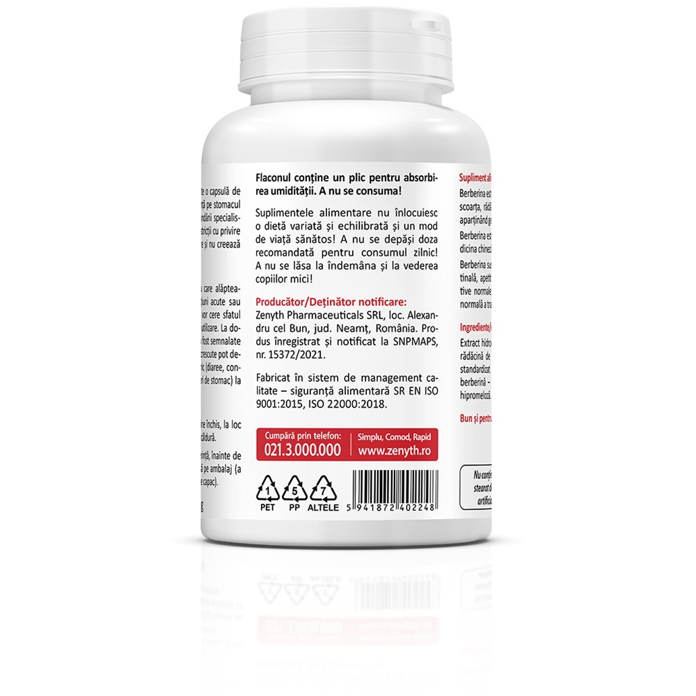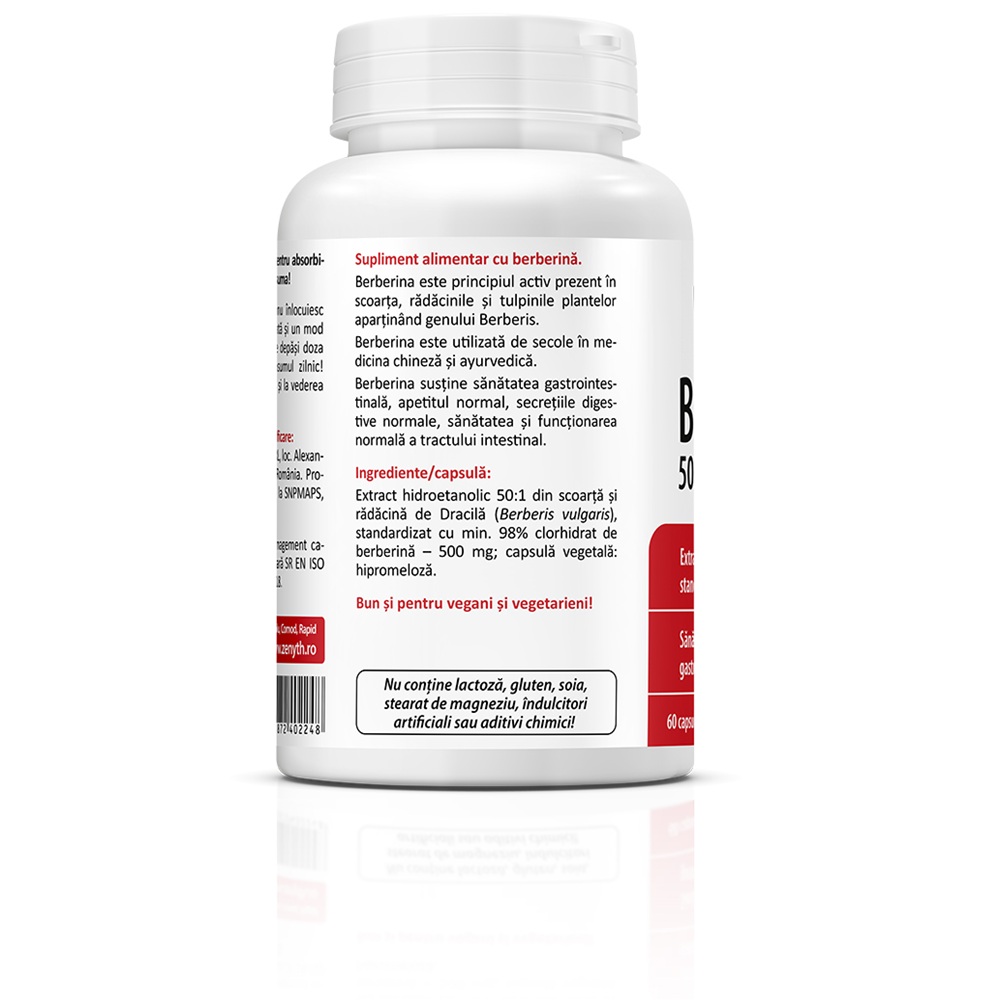 Ingrediente:Extract hidroetanolic 50:1 din scoarță și rădăcină de Dracilă (Berberis vulgaris), standardizat cu min. 98% clorhidrat de berberină - 500 mg; capsulă vegetală: hipromeloză.
