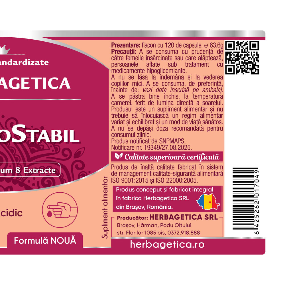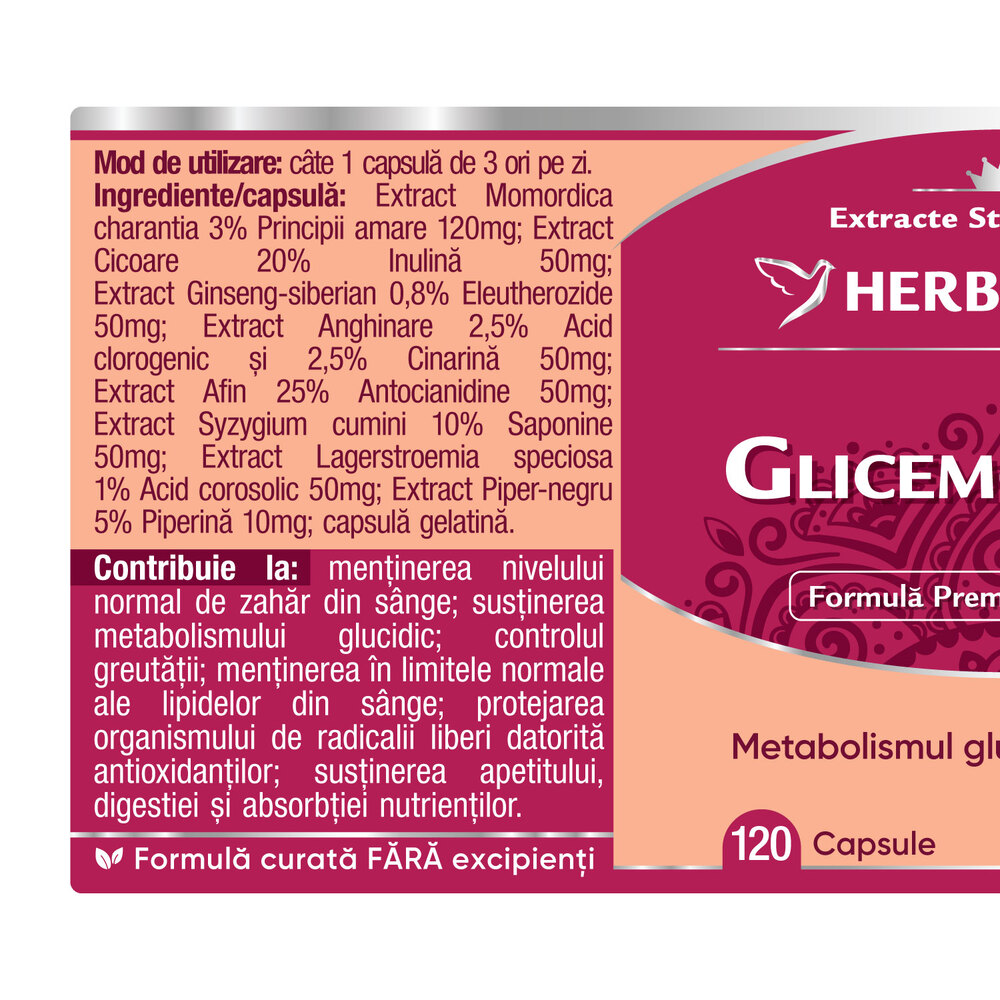 Extract Momordica charantia 3% Principii amare 120 mg; Extract Cicoare 20% Inulina 50 mg; Extract Ginseng-siberian 0,8% Eleutherozide 50 mg; Extract Anghinare 2,5% Acid clorogenic si 2,5% Cinarina 50 mg; Extract Afin 25% Antocianidine 50 mg; Extract Syzygium cumini 10% Saponine 50 mg; Extract Lagerstroemia speciosa 1% Acid corosolic 50 mg; Extract Piper-negru 5% Piperina 10 mg; capsula: gelatina.