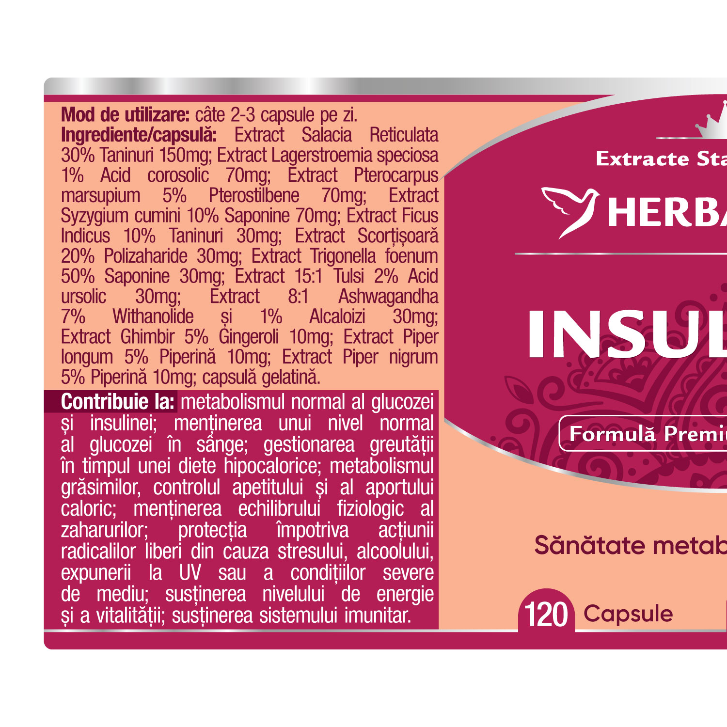 Ingrediente:/capsulă: Extract Salacia Reticulata 30% Taninuri 150mg; Extract Lagerstroemia speciosa 1% Acid corosolic 70mg; Extract Pterocarpus marsupium 5% Pterostilbene 70mg; Extract Syzygium cumini 10% Saponine 70mg; Extract Ficus Indicus 10% Taninuri 30mg; Extract Scorțișoară 20% Polizaharide 30mg; Extract Trigonella foenum 50% Saponine 30mg; Extract 15:1 Tulsi 2% Acid ursolic 30mg; Extract 8:1 Ashwagandha 7% Withanolide şi 1% Alcaloizi 30mg; Extract Ghimbir 5% Gingeroli 10mg; Extract Piper longum 5% Piperină 10mg; Extract Piper nigrum 5% Piperină 10mg; capsulă gelatină.