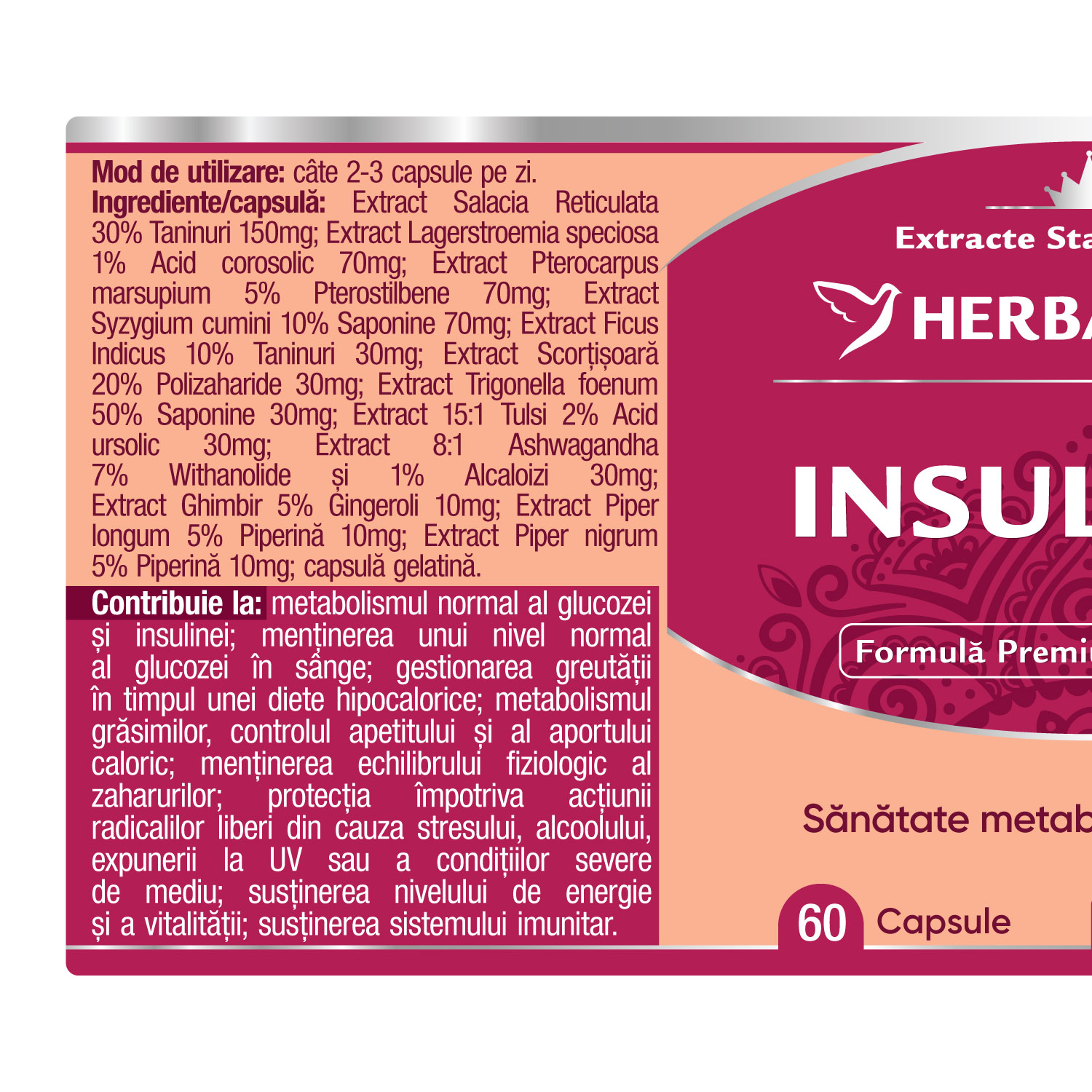 Ingrediente:/capsulă: Extract Salacia Reticulata 30% Taninuri 150mg; Extract Lagerstroemia speciosa 1% Acid corosolic 70mg; Extract Pterocarpus marsupium 5% Pterostilbene 70mg; Extract Syzygium cumini 10% Saponine 70mg; Extract Ficus Indicus 10% Taninuri 30mg; Extract Scorțișoară 20% Polizaharide 30mg; Extract Trigonella foenum 50% Saponine 30mg; Extract 15:1 Tulsi 2% Acid ursolic 30mg; Extract 8:1 Ashwagandha 7% Withanolide şi 1% Alcaloizi 30mg; Extract Ghimbir 5% Gingeroli 10mg; Extract Piper longum 5% Piperină 10mg; Extract Piper nigrum 5% Piperină 10mg; capsulă gelatină.