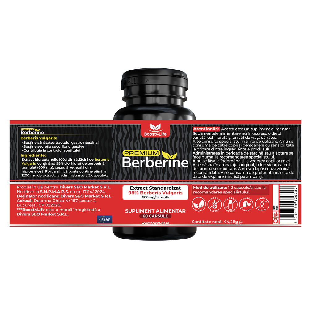 Ingrediente:Ingrediente/capsula: extract hidroetanolic 100:1 din radacini de Berberis Vulgaris, continand 98% clorhidrat de berberina granulat – 600 mg.